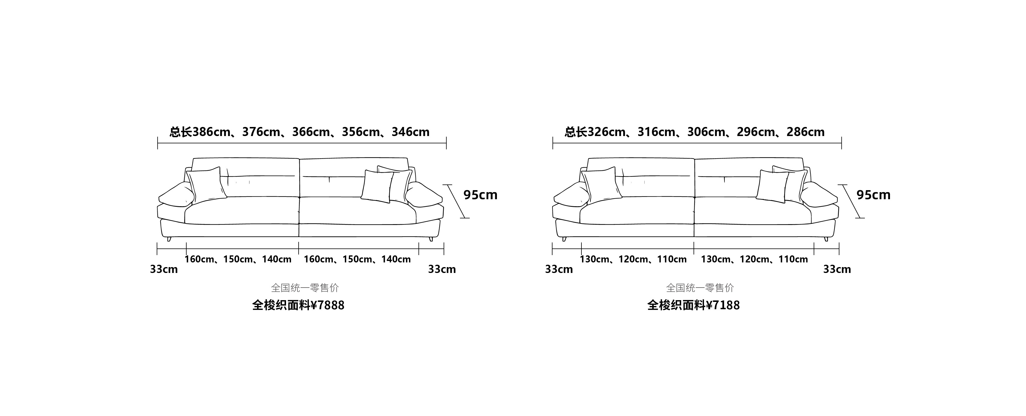 2、产品重量说明:偏扶手130cm一件一垫重量约为60kg,总长二件二垫326cm重量约为120kg