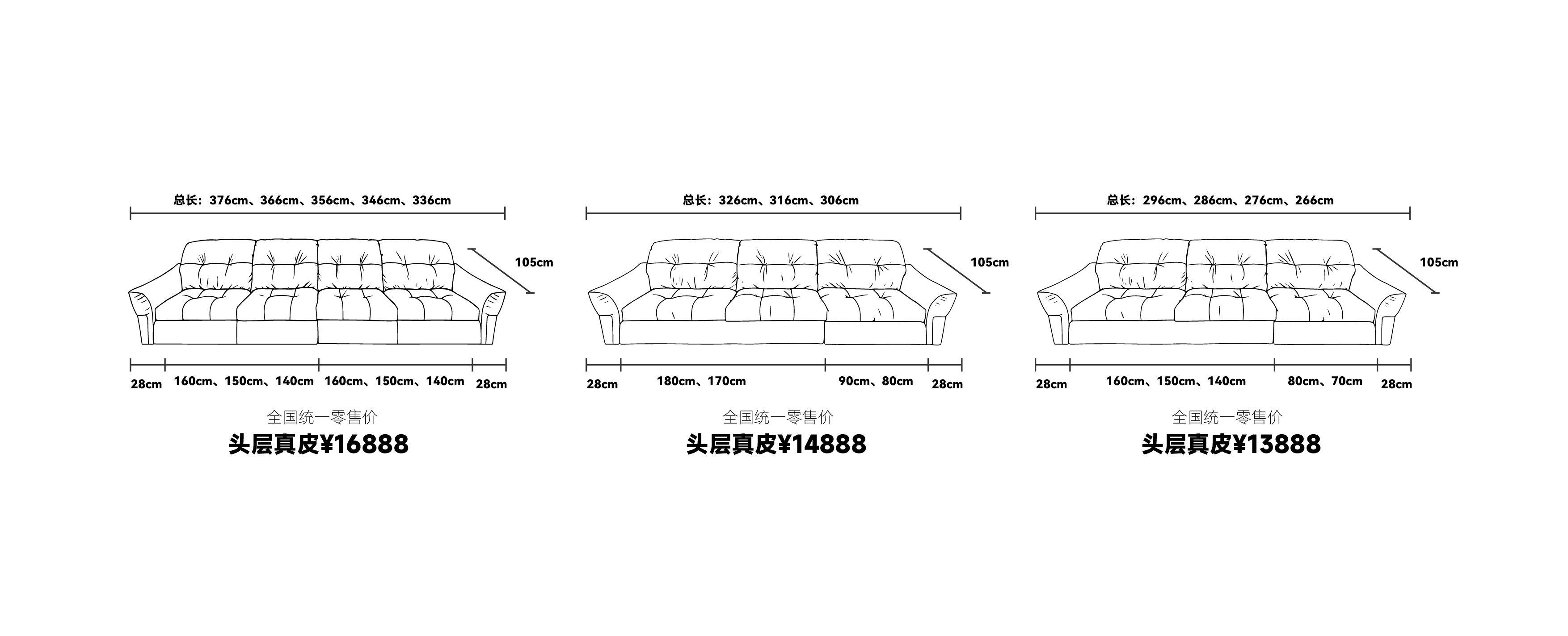 2、产品重量说明:偏扶手180cm一件二垫重量约100kg;偏扶手90cm一件一垫重量约为65kg;总长326cm三件三垫重量为165kg