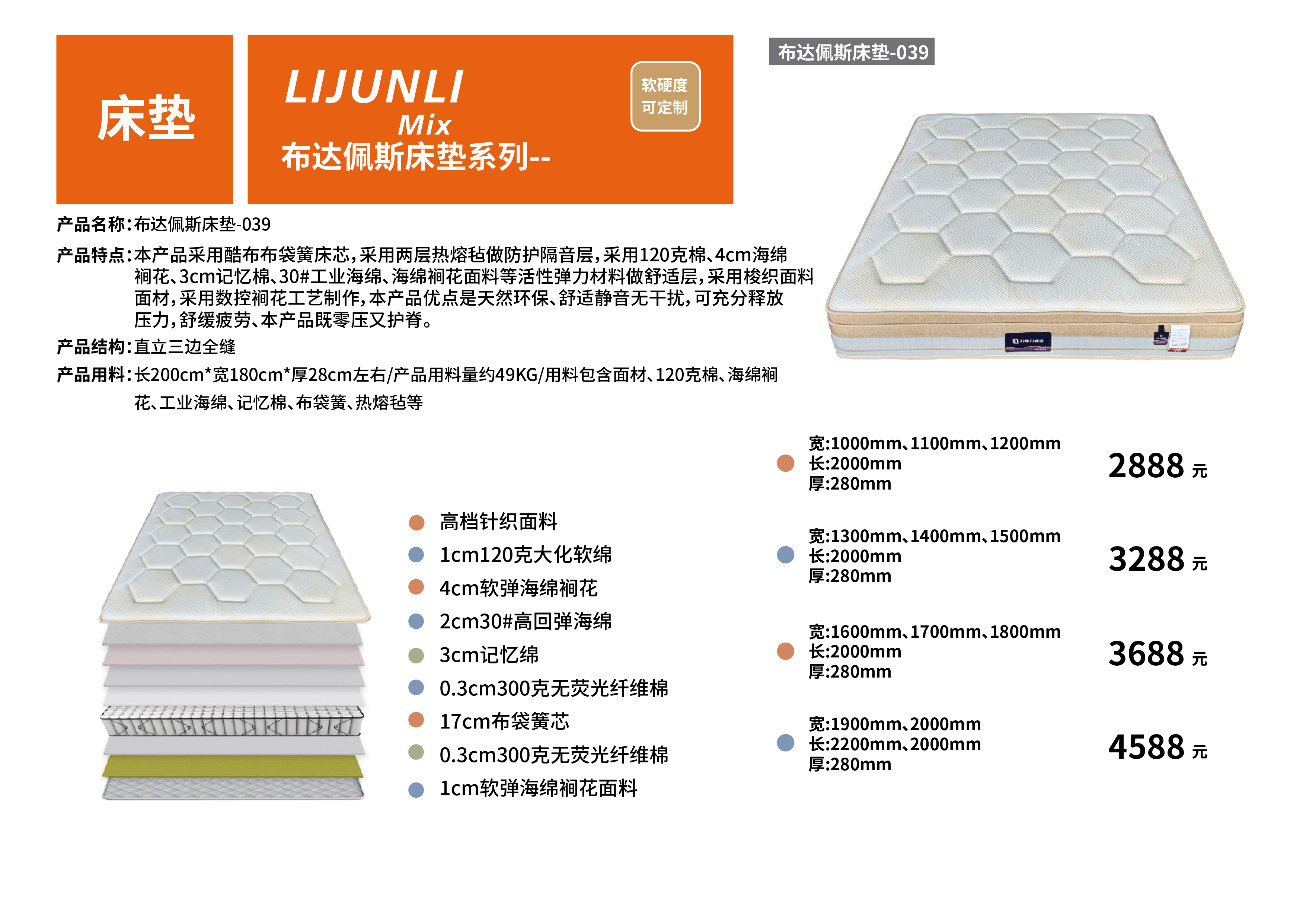 3、订购本产品其中一种尺寸的订单填写举例:布达佩斯床垫-039 1800mm*2000mm*280mm