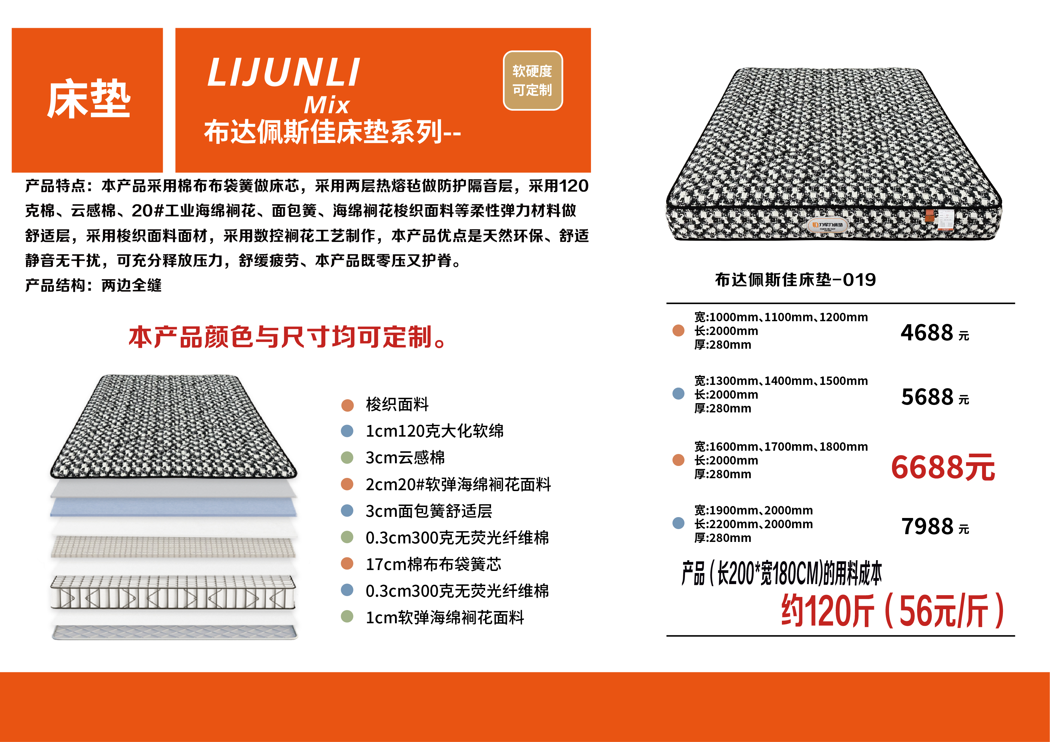 3、订购本产品其中一种尺寸的订单填写举例:布达佩斯佳床垫-019 1800mm*2000mm*280mm