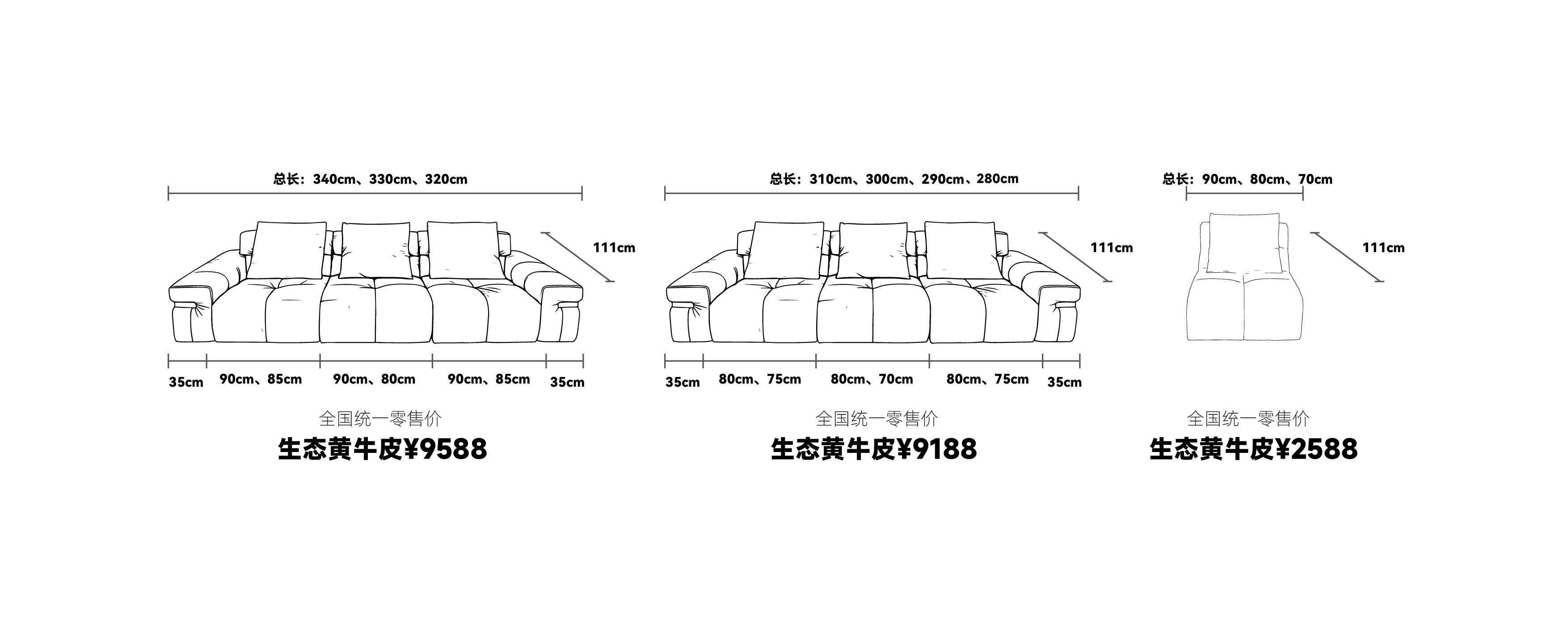3、产品下单举例说明:本产品定做尺寸为330cm,定做模式为(外挂双扶手+三件三垫)的情况下订单举例:自在家沙发TS-057-(2)C 总长330cm(外挂右扶手35cm+一件一垫85cm)+(无扶手+一件一垫90cm)+(外挂左扶手35cm+一件一垫85cm)