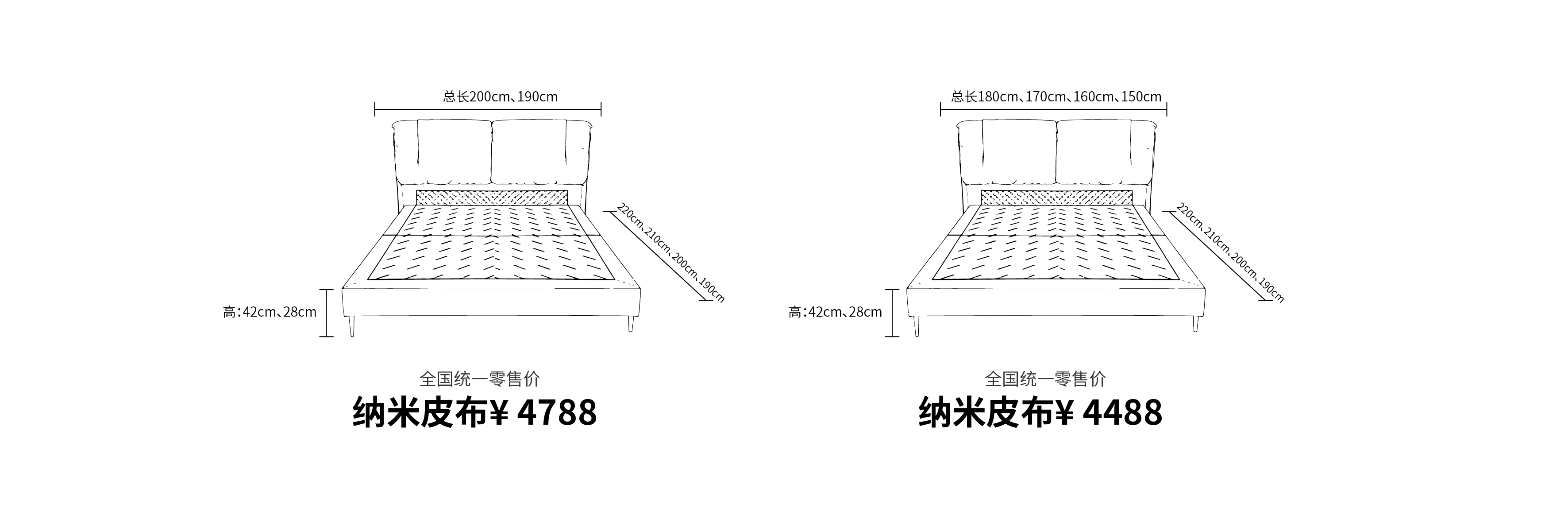 3、订购本产品其中一种尺寸的订单填写举例:范登堡软床BB-035-(2)A -整装座(长200cm*宽180cm*高28cm)+床头