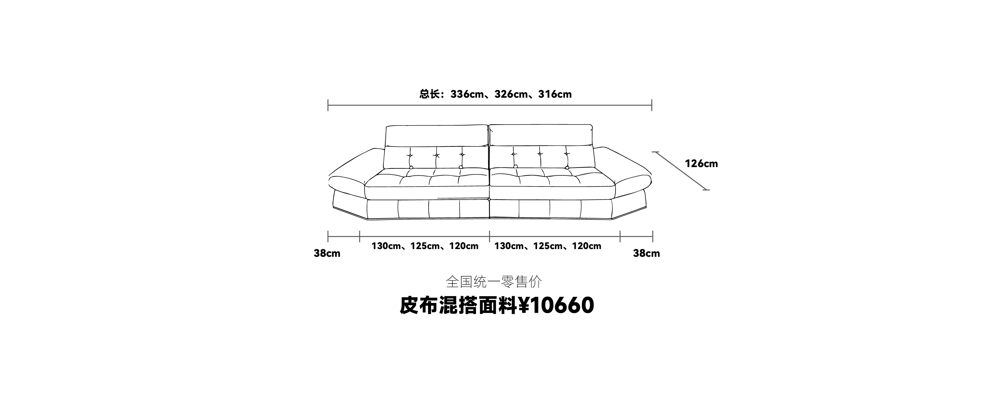3、 产品下单举例说明:本产品定做尺寸为326cm,定做模式为(连体双扶手+二件二垫)的情况下订单举例:米诺奇沙发BS-017-(1)B 总长326cm(连体右扶手38cm+一件一垫125cm)+(连体左扶手38cm+一件一垫125cm)