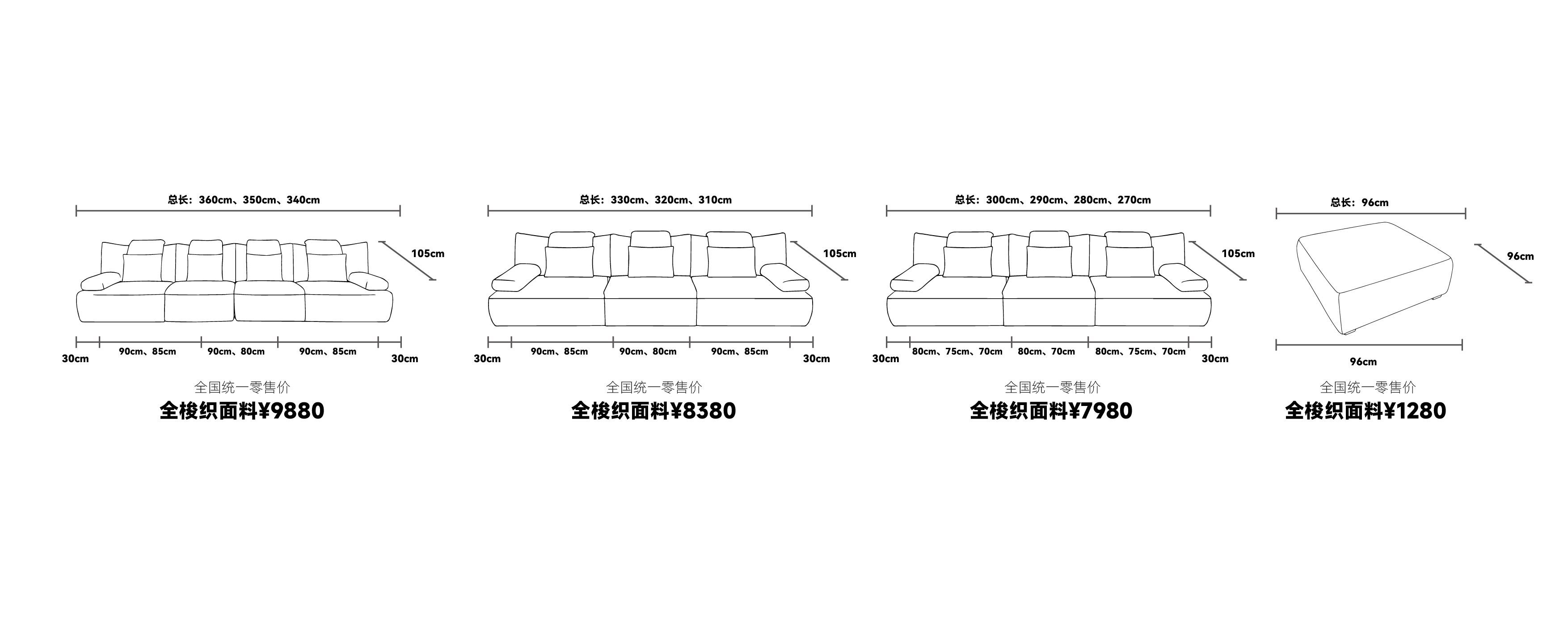 3、产品下单举例说明:本产品定做尺寸为330cm,定做模式为(上托双扶手+三件三垫)的情况下订单举例:高弹模塑6系沙发BB-001-(1)B 总长330cm(上托右扶手30cm+一件一垫90cm)+(无扶手+一件一垫90cm)+(上托左扶手30cm+一件一垫90cm)