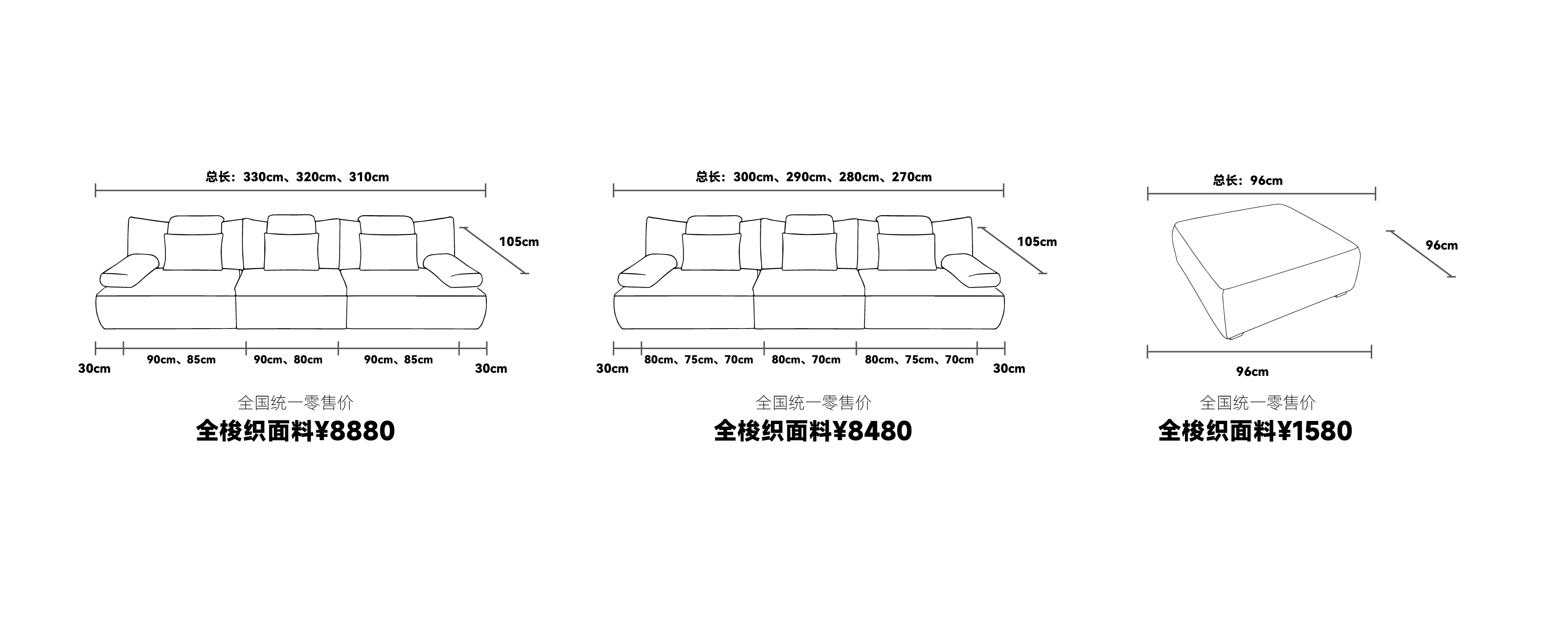3、产品下单举例说明:本产品定做尺寸为330cm,定做模式为(上托双扶手+三件三垫)的情况下订单举例:高弹模塑6系沙发BB-001-(3) C 总长330cm(上托右扶手30cm+一件一垫90cm)+(无扶手+一件一垫90cm)+(上托左扶手30cm+一件一垫90cm)
