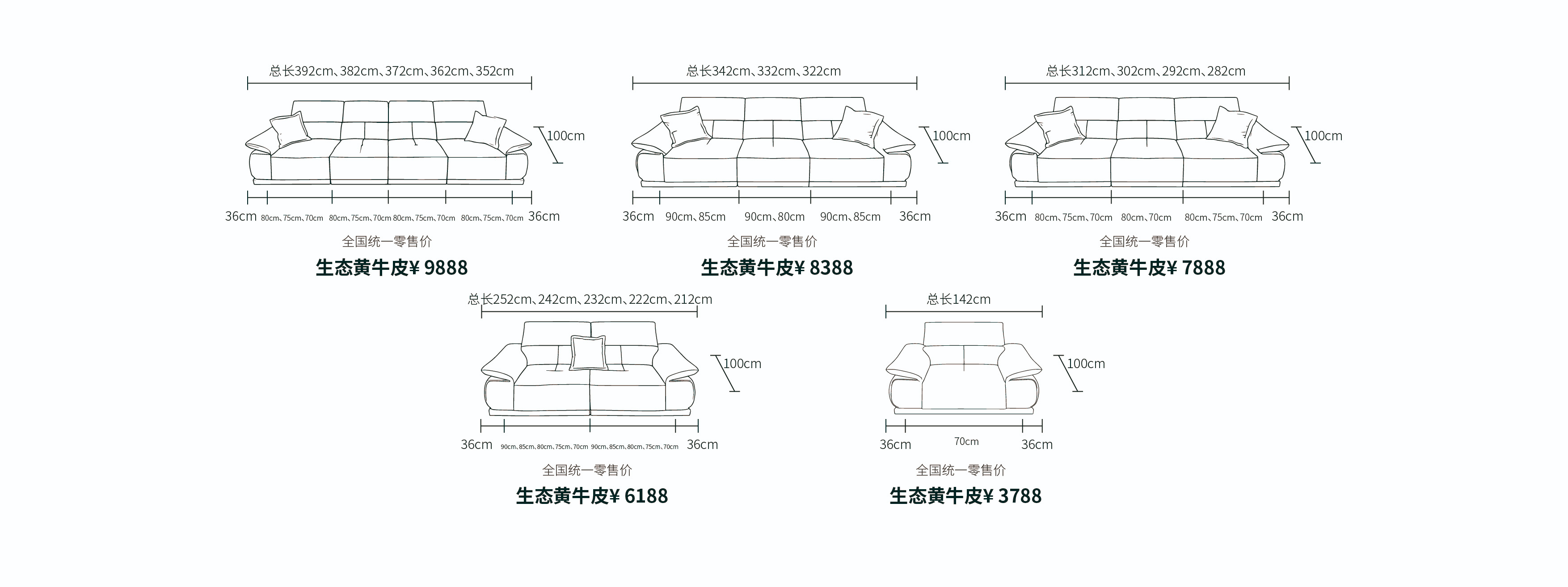 3、产品下单举例说明:本产品定做尺寸为312cm,定做模式为(外挂双扶手+三件三垫)的情况下订单举例:乐之宝沙发SS-050-(1)A 总长312cm(外挂右扶手36cm+一件一垫80cm)+(无扶手+一件一垫80cm)+(外挂左扶手36cm+一件一垫80cm)