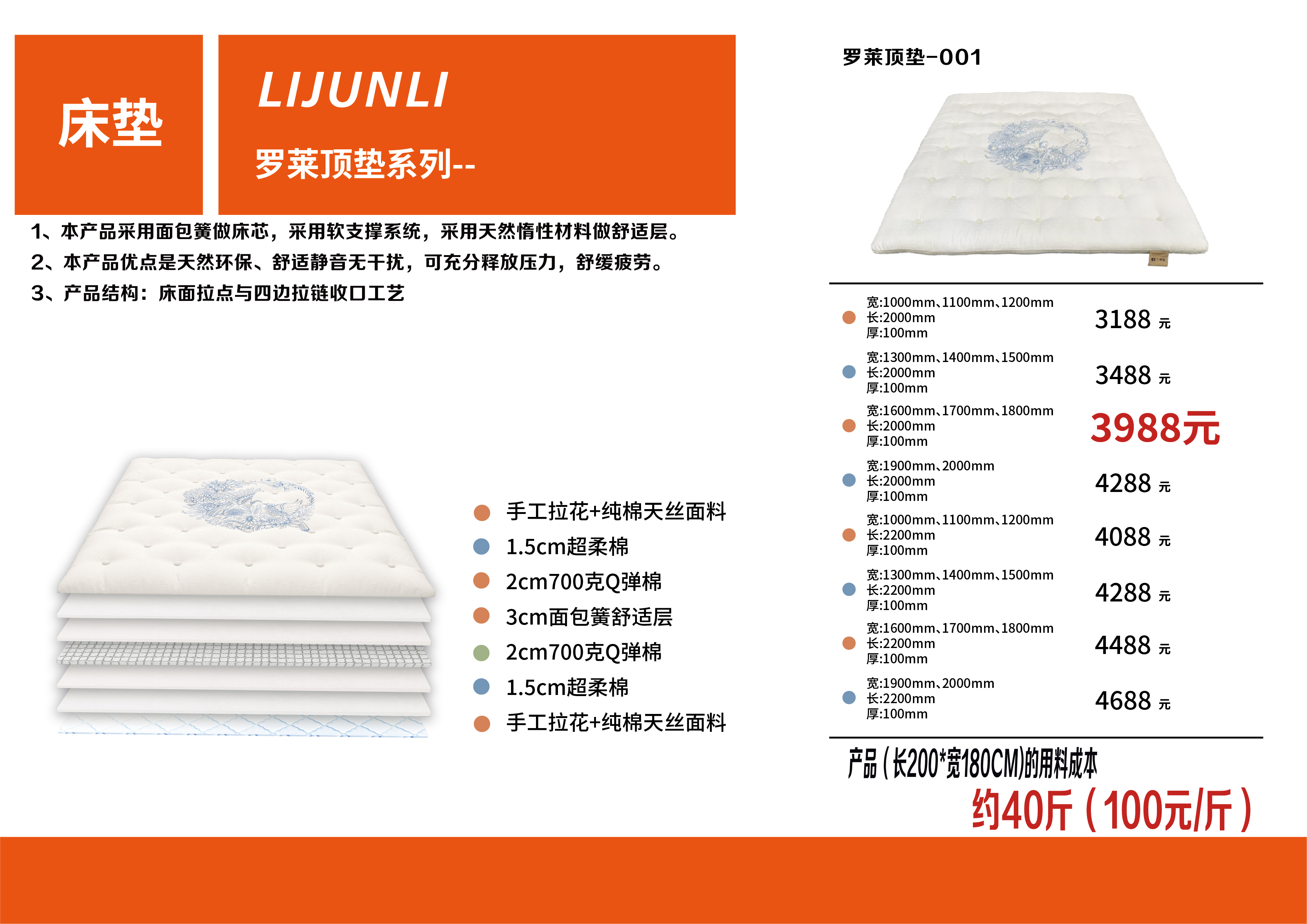 3、订购本产品其中一种尺寸的订单填写举例:罗莱顶垫-001 1800mm*2000mm*100mm