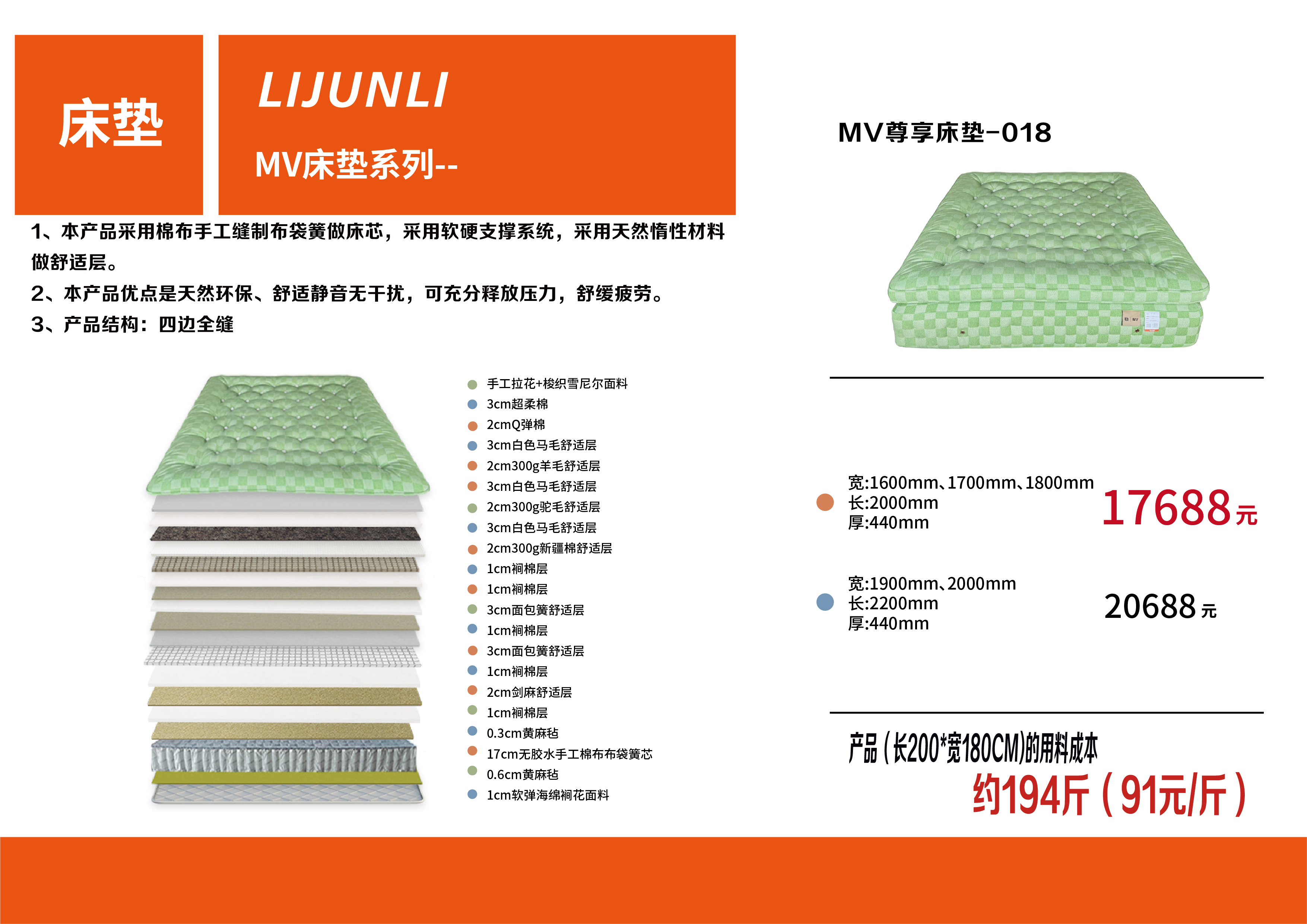 3、订购本产品其中一种尺寸的订单填写举例:MV尊享床垫-018 1800mm*2000mm*440mm