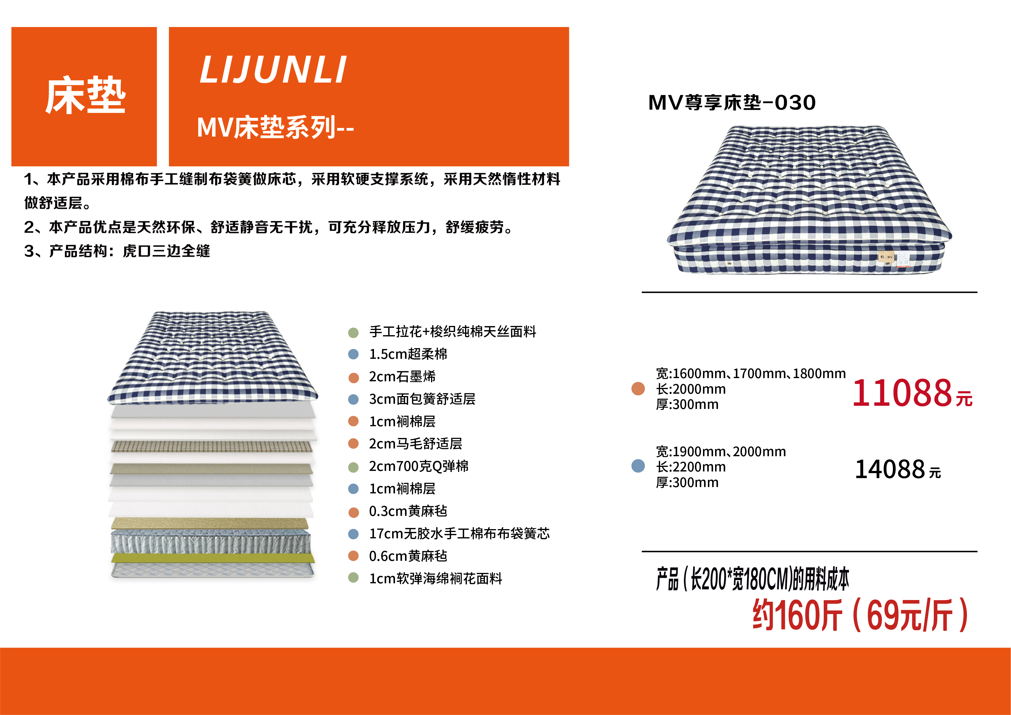 3、订购本产品其中一种尺寸的订单填写举例:MV尊享床垫-030 1800mm*2000mm*300mm
