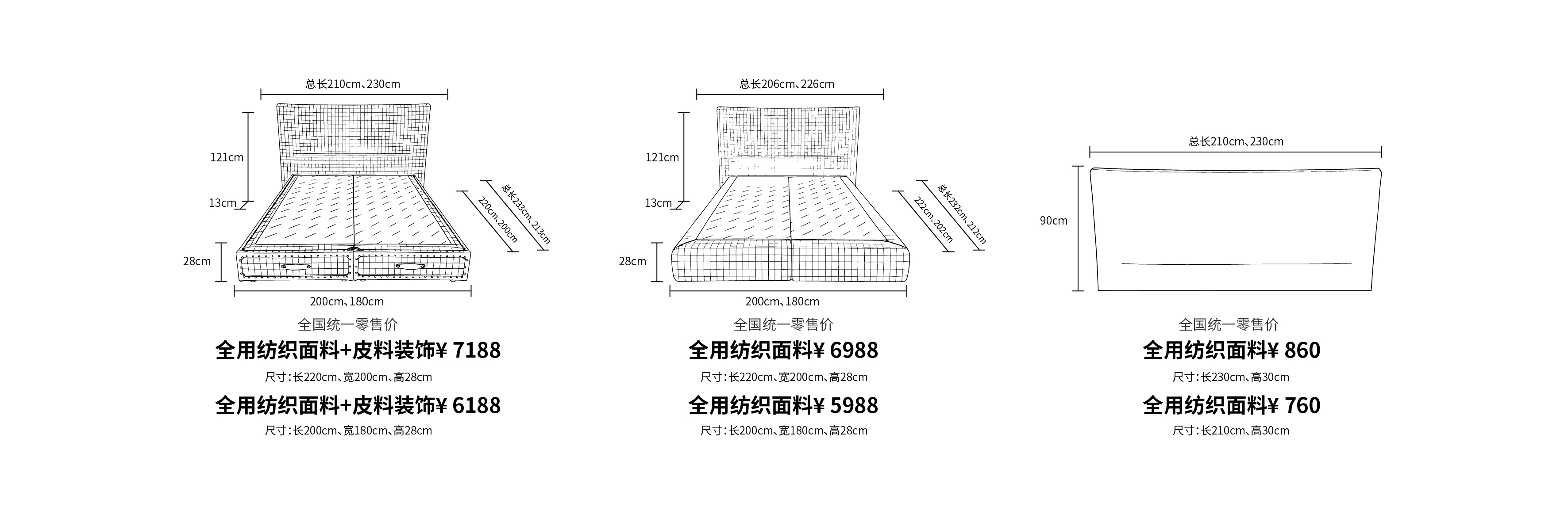 (2)全拆洗床座床头高123cm(含腿子5cm),厚13cm,宽比床座上下两侧各探13cm;全包床座床头高123cm(含腿子5cm),厚13cm,宽比床座上下两侧各探15cm;下单时以床座尺寸为准,床头按上述规律制作。