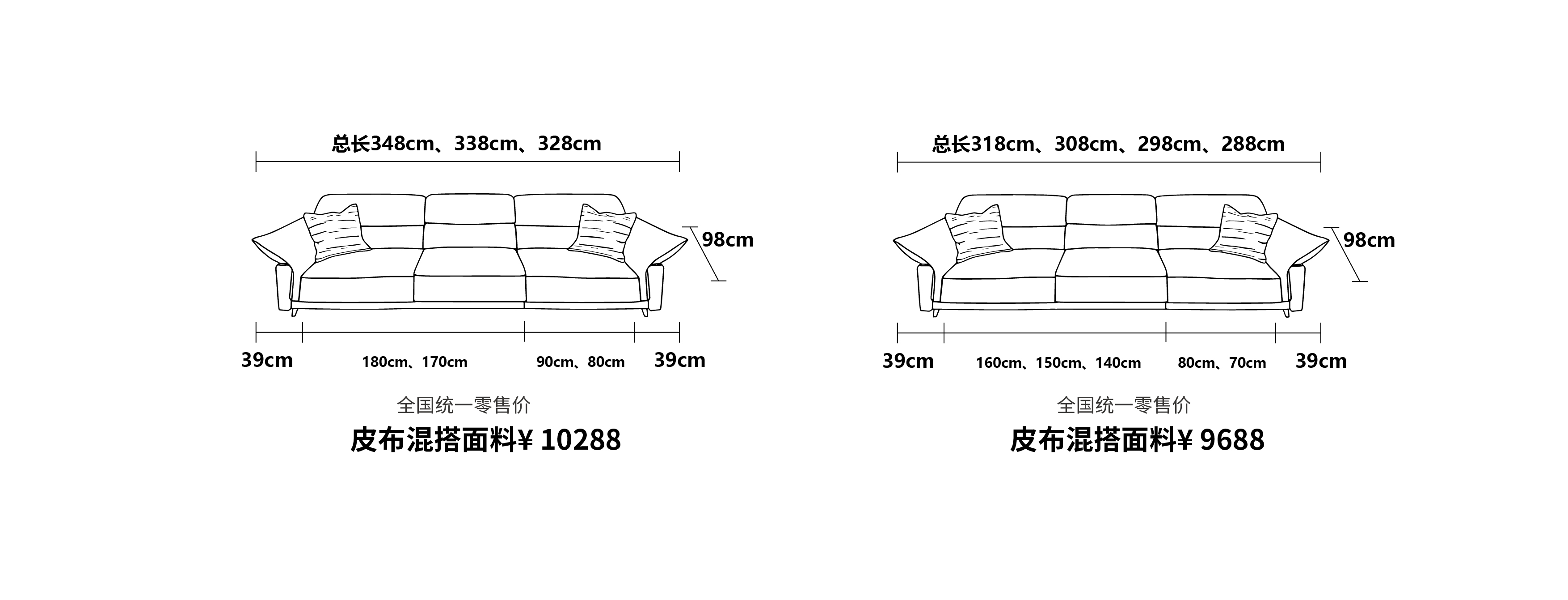 3、产品下单举例说明:本产品定做尺寸为348cm,定做模式为(上托双扶手+二件三垫)的情况下订单举例:意品居佳沙发BS-013-(1)C 总长348cm(外挂右扶手39cm+一件二垫180cm)+(外挂左扶手39cm+一件一垫90cm)