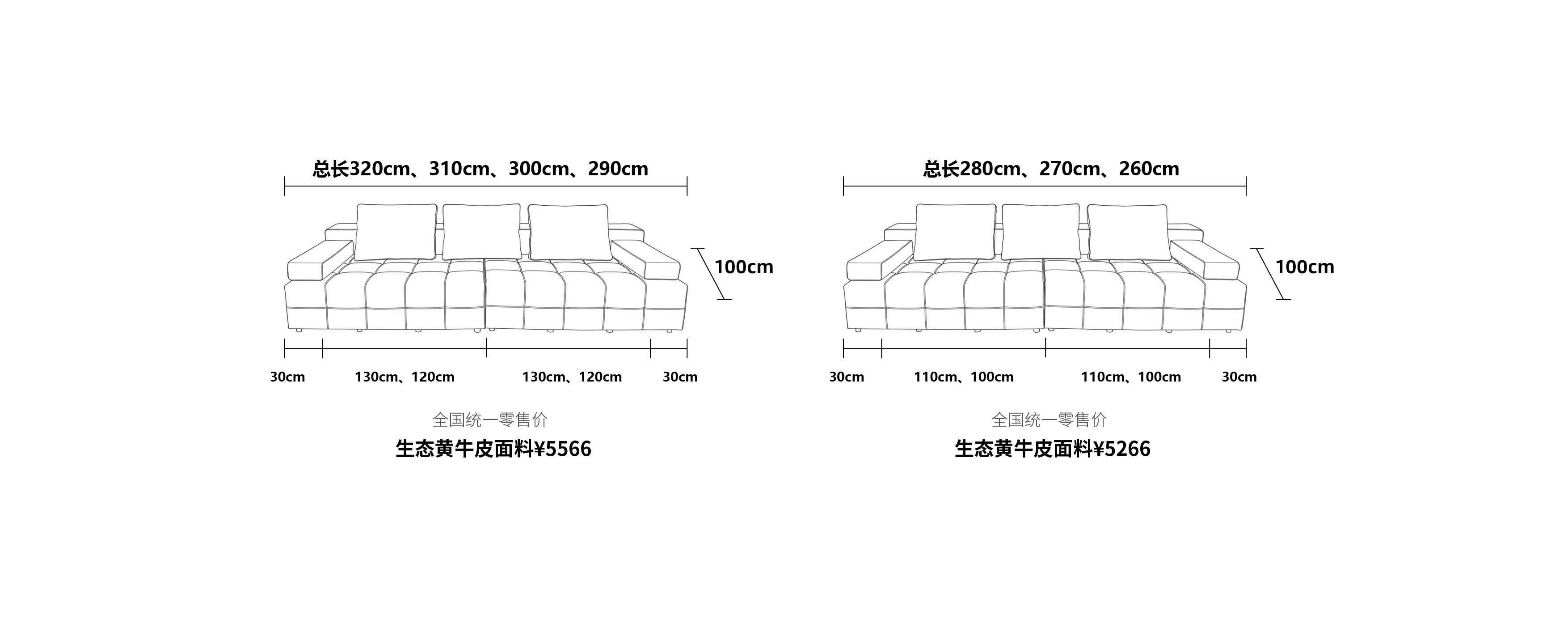 3、产品下单举例说明:本产品定做尺寸为320cm,定做模式为(上托双扶手+二件二垫)的情况下订单举例:5系沙发SS-001-(1)A 总长320cm(上托右扶手30cm+一件一垫130cm)+(上托左扶手30cm+一件一垫130cm)